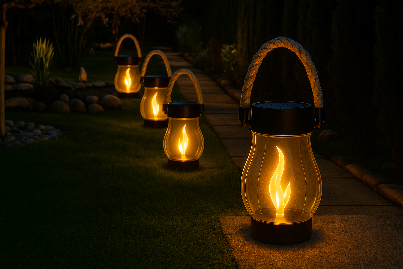Solar lanterns on a stone path with glowing flames, set against a dark background.